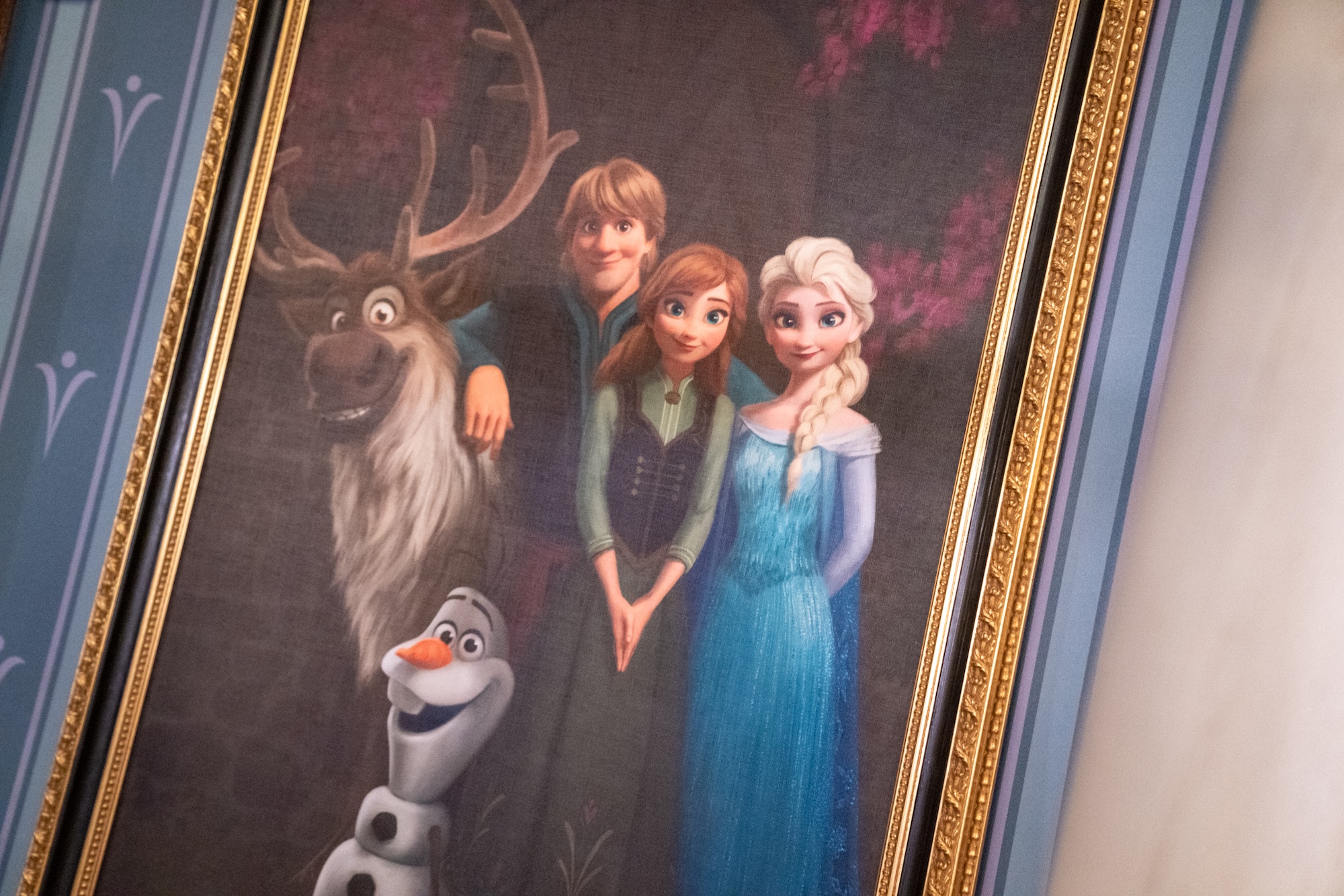 En pénétrant dans Rencontre Royale, les visiteurs sont transportés dans le Château d’Arendelle, et les plus attentifs reconnaitront sans peine la plupart des tableaux qui se trouvent dans l’entrée : en effet, plusieurs apparaissent dans la scène du « Renouveau » de La Reine des Neiges (comme celui qui fait référence au tableau Les Hasards heureux de l’escarpolette de Jean-Honoré Fragonard), ou même « Je voudrais un bonhomme de neige » avec le portrait de Jeanne d’Arc. Les deux portraits de famille, de chaque côté de la salle, proviennent quant à eux de la scène « Dans un autre monde » de La Reine des Neiges II.“