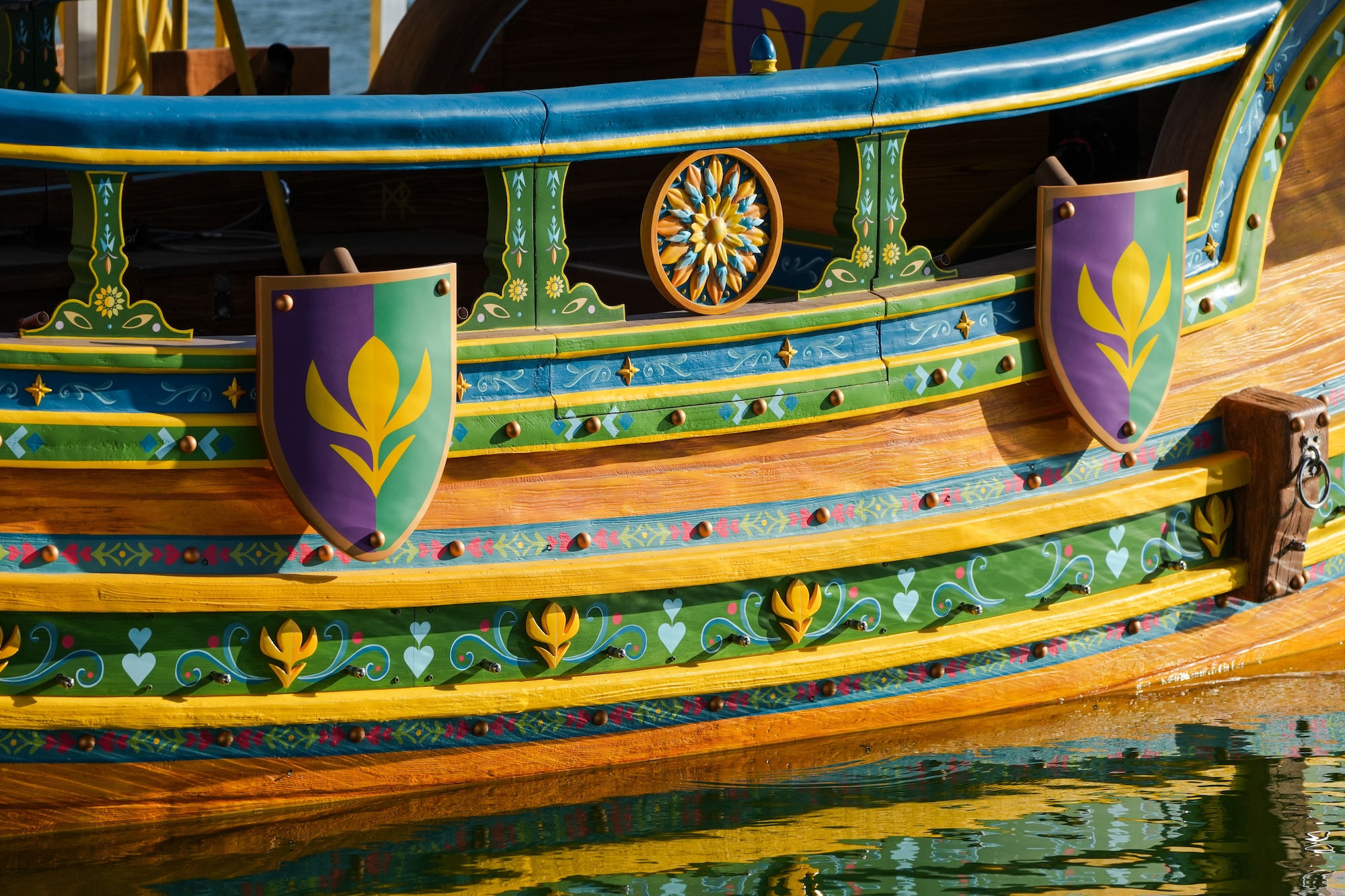 Enfin, les courbes et la décoration du troisième bateau sont à l’aune royale d’Anna et Elsa, reprenant les couleurs des deux reines, celles-là mêmes que l’on retrouve sur la fleur de neige, unissant le soleil et la glace.