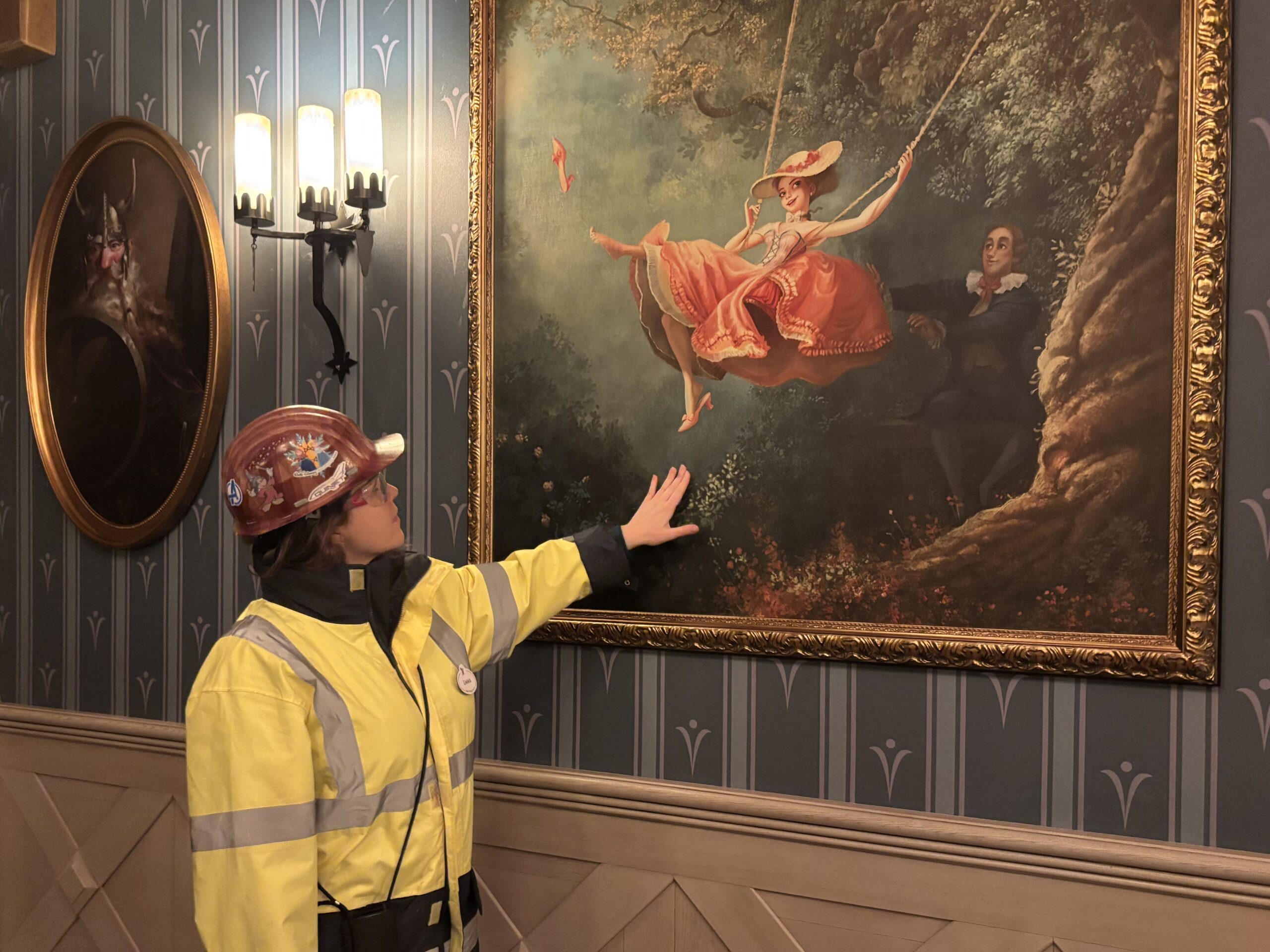 Inside, there are a lot of references to the animated film Frozen. In the waiting area, guests will recognize several of the paintings in front of which Anna dances during the “For the First Time in Forever” sequence, including a reimagined version of Jean-Honoré Fragonard’s famous painting The Swing. On either side of the room, two facing family portraits can also be seen: one depicting Anna and Elsa as children alongside their parents, and the other showing Anna and Elsa as adults with Kristoff, Sven, and Olaf. For Emma Yeates, Senior Manager, Show Design at Walt Disney Imagineering Paris, this room is particularly important: “It allows guests to truly feel transported into Arendelle Castle. From the wallpaper to the paintings, we recreated iconic elements seen in Frozen, along with portraits of members of the royal family to enhance this sense of authenticity.”