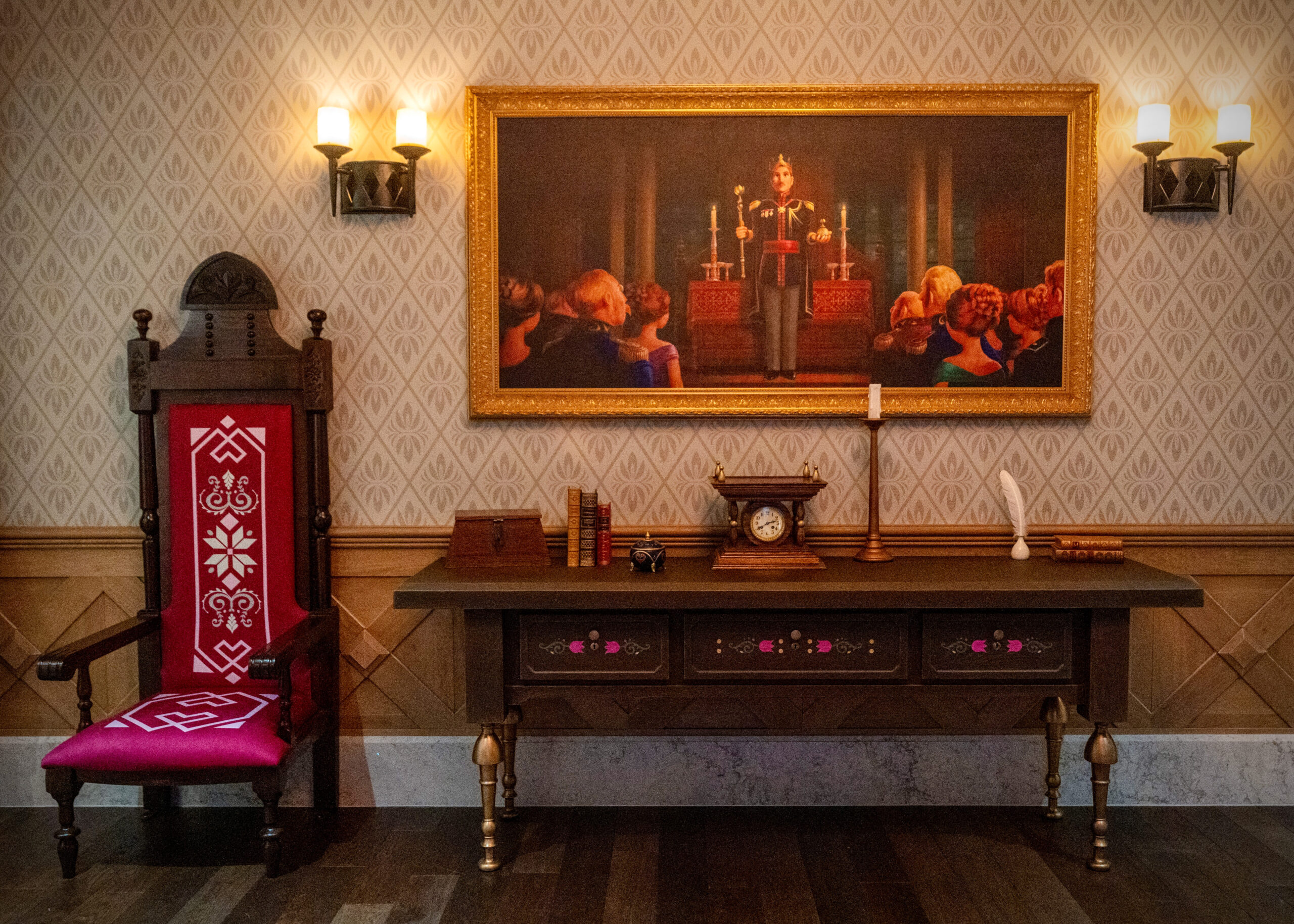 The room where the encounter takes place is just as impressive. On the beautiful painting depicting the coronation of King Agnarr, there are the royal orb and scepter, the Arendelle symbols Elsa herself wears during her own coronation. In one corner of the room, attentive guests will also recognize the clock against which young Anna leans during the song “Do You Want to Build a Snowman?”