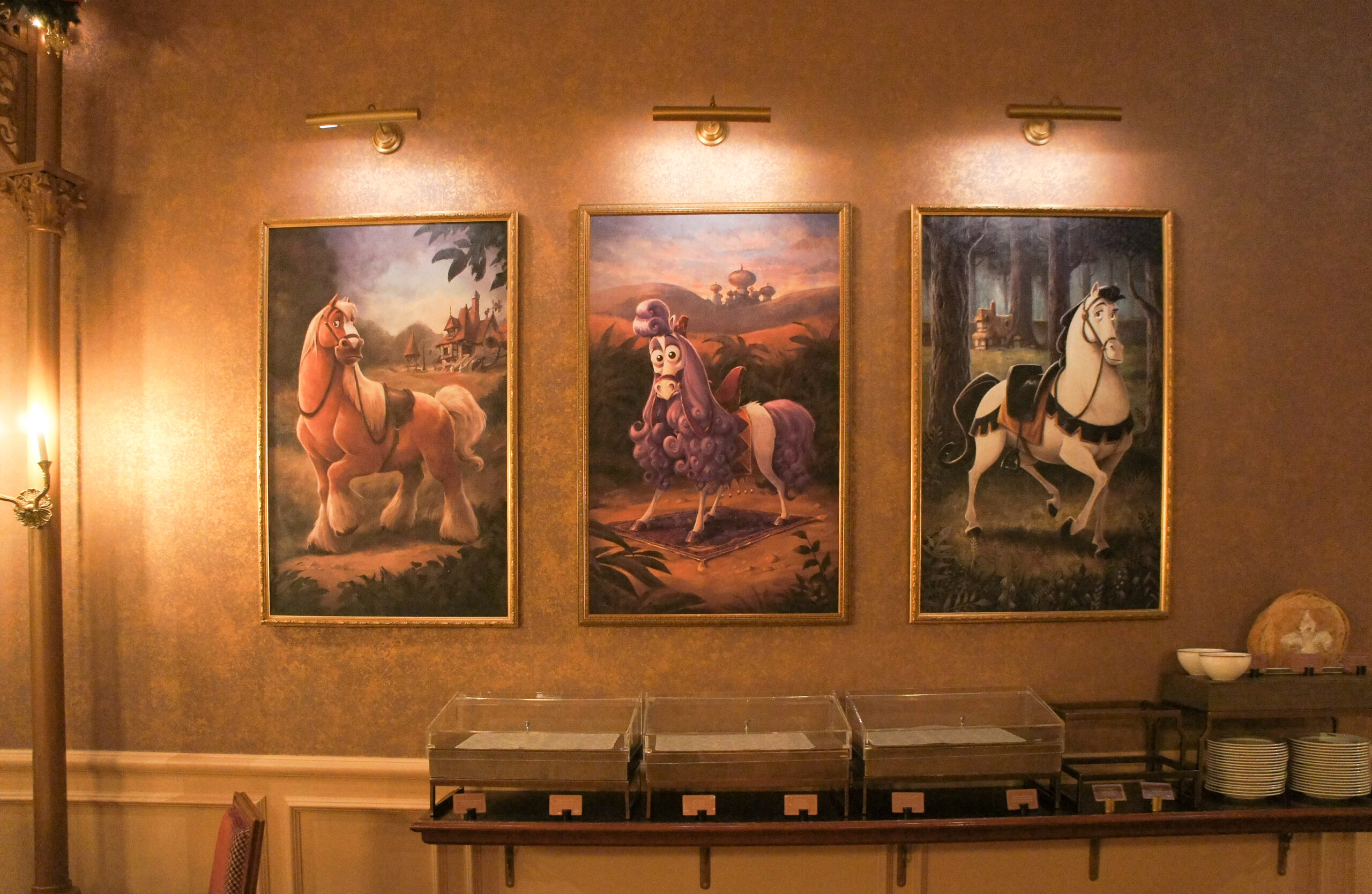 Ainsi, la Salle du Carrousel rend hommage à des montures iconiques et parfois inattendues parmi lesquelles : Maximus (Raiponce), Samson (La Belle au Bois Dormant), Khan (Mulan), Philibert (La Belle et la Bête) et Angus (Rebelle).